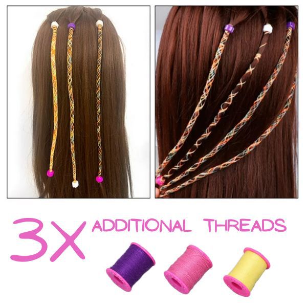 - Lieferumfang: 1x Haarflechtmaschine, 12x Haarspangen, 3x Garn (gelber, rosa und violetter Garn), 2x Zubehör zur leichteren Handhabung