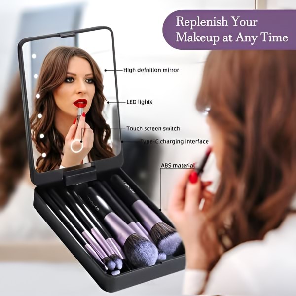 Jedes Set wird mit einem kompakten Reiseetui mit integriertem LED-Spiegel geliefert, das sich perfekt für das Auffrischen unterwegs, auf Reisen oder zur einfachen Aufbewahrung eignet.